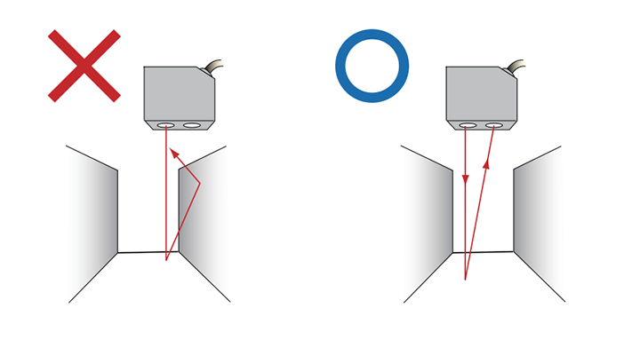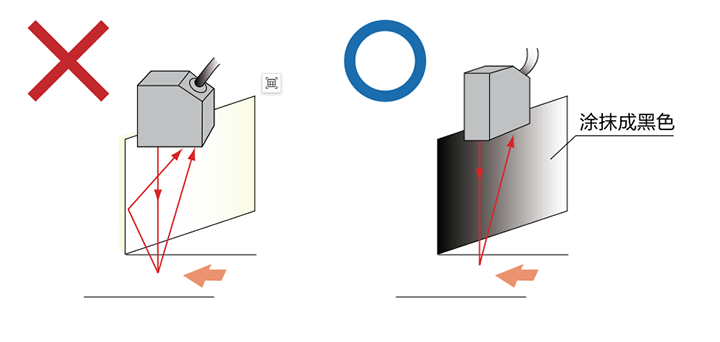 被測物為黑色物體時,反射光量較少,使得受光素子的受光量較少,導致分辨率下降??梢酝ㄟ^縮短檢測距離,讓有效測量范圍內盡可能的縮短傳感器的檢測距離,確保受光素子接收到足夠的受光量。也可以【正反射】方式傾斜安裝,時激光的入射角等于反射角,這樣提高受光素子接收的受光量。