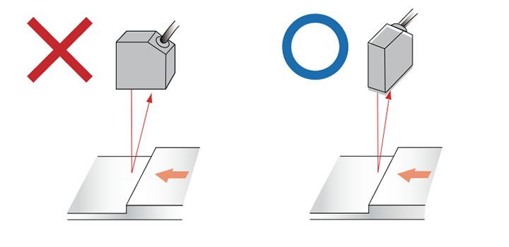 被測物的表面存在段差的情況時,請將傳感器的投光光軸和受光光軸構成的平面平行于段差的邊緣區(qū)域對測量的影響。