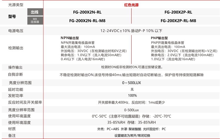 ECOTTER 外來光源檢測光纖傳感器 FG-200X2N-RL 可以對所有光源進行檢測,而不僅僅是對傳感器自身發(fā)出的光進行檢測,在工業(yè)自動化的應用中,可以檢測手機屏是否正常亮起,電子產(chǎn)品的指示燈是否正常等檢測。