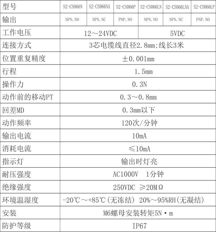 S2-CS066系列操作力非常小,僅0.3N的力即可操作。動作前的移動PT是0.3~0.8毫米,行程1.5毫米。信號輸出時,在機(jī)身尾部有信號指示燈亮起。