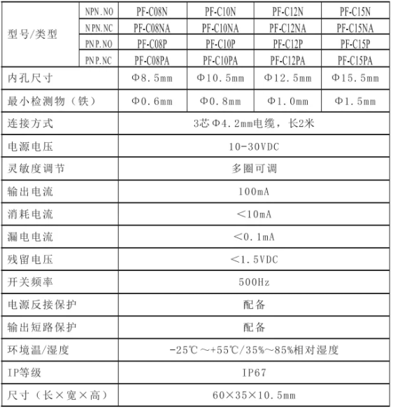 這款接近開關(guān)的整體是環(huán)形,檢測區(qū)域為圓型,有多種尺寸可供選擇。其最小檢測物體也隨著檢測區(qū)域大小的變化而變化。最小檢測物可檢測0.6mm的磁性物體(孔徑8.5mm)