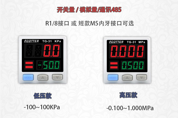 ECOTTER數(shù)顯壓力表有高壓款-0.1~1mpa 和 低壓款 -100~100kpa兩種量程不同的規(guī)格,低壓款常用于負(fù)壓檢測(cè)。這個(gè)系列產(chǎn)品有開(kāi)關(guān)量、模擬量及通訊485款可選。