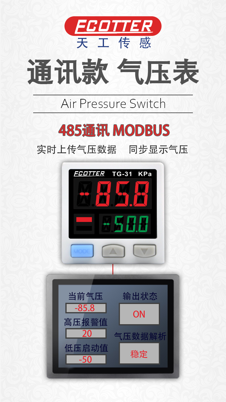 通過壓力表可以設(shè)置壓力表的地址、波特率,長按設(shè)置鍵進入菜單設(shè)置。壓力表的通訊功能上傳氣壓數(shù)據(jù),連接觸摸屏等實現(xiàn)智能化操作。