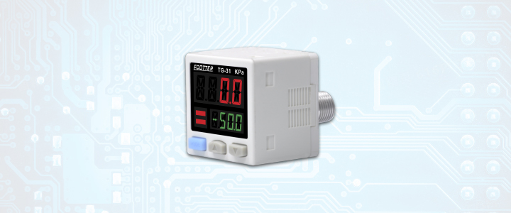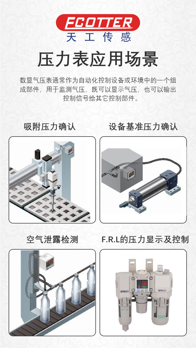 ECOTTER數(shù)顯壓力表監(jiān)測氣壓之余,可以根據(jù)設(shè)定值輸出信號,如在吸附確認的應(yīng)用中,吸到物料和沒吸到物料的時候會有明顯的區(qū)別,氣壓表就可以設(shè)置在不同的氣壓輸出信號。