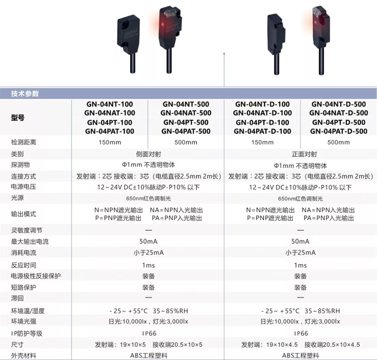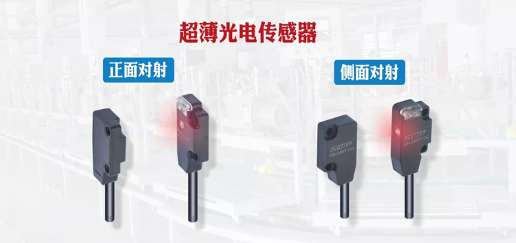 ECOTTER 超薄光電對射型 GN-04T系列產品為目前面市場自動化應用中最小規(guī)格的光電型傳感器,它的最重要的特點是:小巧、薄的體型結構,只需擁有些許空間,即可安裝。并且檢測距離更長,最大可達500mm。具有正面對射和側面對射兩種款式可供選擇。